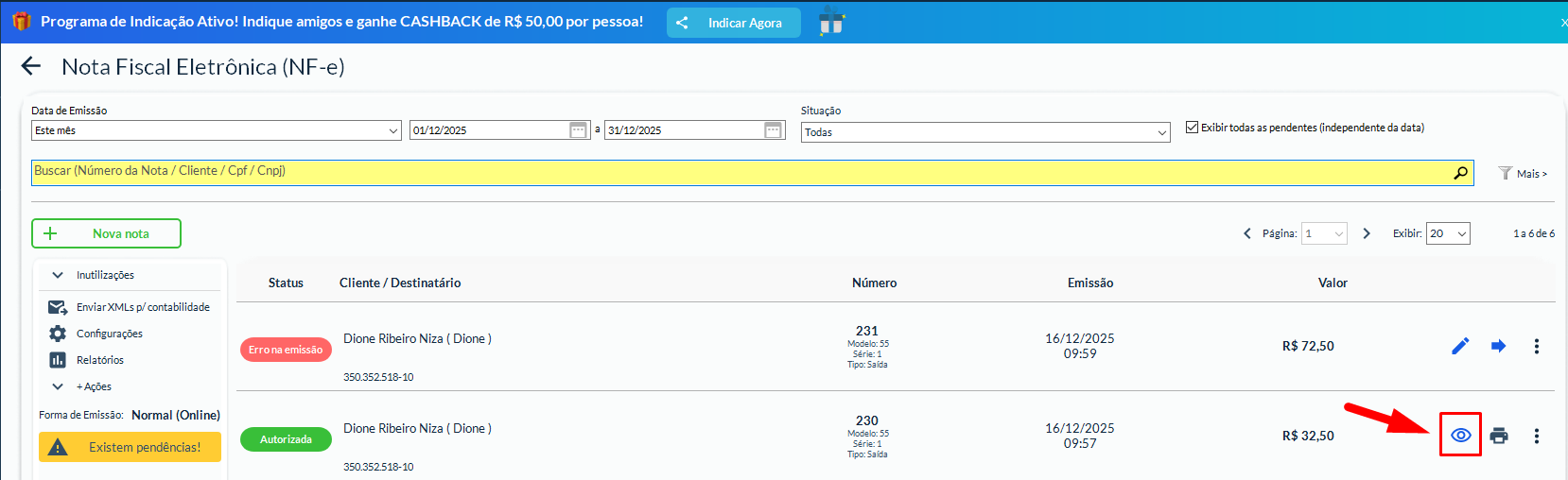 NFC-e: clique no ícone do olho (👁️) para visualizar/consultar a nota.