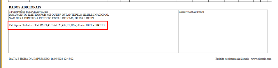 A informação é exibida automaticamente no campo “Informações Complementares”, no final da nota.